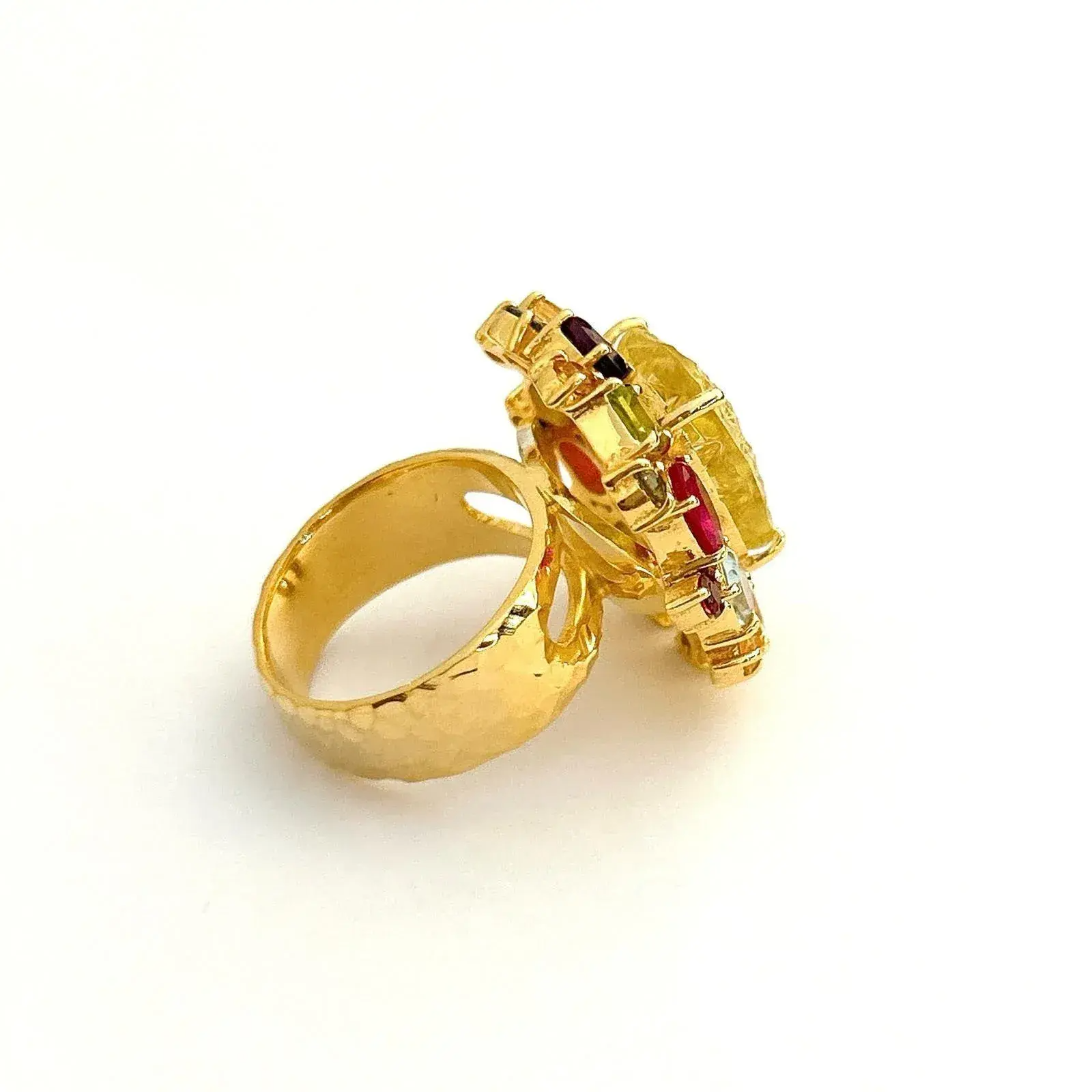 The "Orient" collection, from which this ring originates, showcases exceptional craftsmanship and incorporates natural gemstones. The ring is set in 18k gold and silver, guaranteeing its quality and durability. It features exquisite gemstones such as Ruby, Fancy Color Sapphires, candy cut Citroen and amethyst further accentuating their beauty.