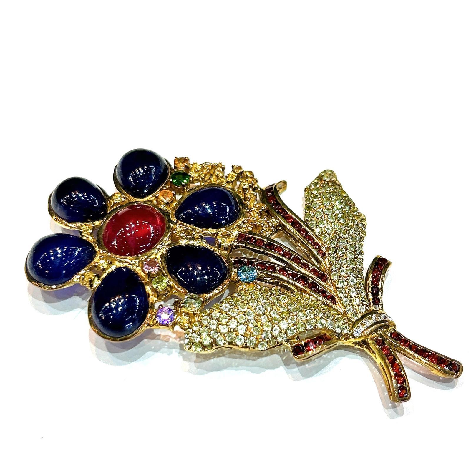 Bochic “Orient” Sapphire, Ruby & Multi Gem Brooch Set In 18K Gold & Silver Natural Ruby - 3 carat Natural Tsavorite - 1 carat Natural Sapphires from Sri Lanka - 12 carat Natural Paridot - 4 carat Natural Garant - 1 carat Natural Blue Topaz - 1 carat Can be worn as a pendent as well. The Brooch is from the "Orient" collection and is the epitome of elegance and versatility. It offer a perfect blend of day to night and swimwear to evening wear, allowing you to effortlessly transition between different occasions and outfits. Wearing this spectacular oriental-style Brooch will undoubtedly make you the center of attention, adding a touch of glamour and sophistication to your favorite caftans, swimwear, or evening attire, enhancing your overall look. The "Orient" collection, from which this Brooch originate, showcases exceptional craftsmanship and incorporates natural gemstones. The Brooch is set in 18k gold and silver, guaranteeing its quality and durability. It features exquisite gemstones such as Ruby, Fancy Color Sapphires, further accentuating their beauty. One of the standout aspects of this Brooch is its fantastic price point, offering remarkable value for the craftsmanship and materials used. It comes with a certificate, ensuring the authenticity and quality. Additionally it includes an appraisal, providing an estimated value for insurance purposes. To protect and showcase the Brooch, it comes with a luxurious Bochic Champagne and satin case. This elegant packaging adds an extra touch of sophistication and makes it a perfect gift option. Lastly, the Brooch is signed, symbolizing the brand's dedication to craftsmanship and excellence. In summary, the Brooch is from the "Orient" collection are a spectacular and versatile accessory. Its exceptional design, incorporation of natural gemstones, and remarkable value make them a desirable choice for any occasion.